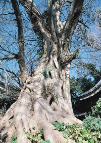 この公孫樹(いちょう)は今宮神社の境内にあり,乳柱が珍しい。地上すれすれのところから3本の幹に分れ,そのうち最大のものは目通り幹まわり4メートルほどある。この主幹の高さ4メートルばかりのところから出ている側枝に,数本の乳柱が垂れさがっている。乳柱の最大のものは長さ2.8メートル,その基部のまわりは1.8メートルもある。乳柱の大きさとしては日本有数のものである。乳柱の発達するのは雌株より雄株に多いという。これは雌株で,その点でも,むしろ例外といえる。