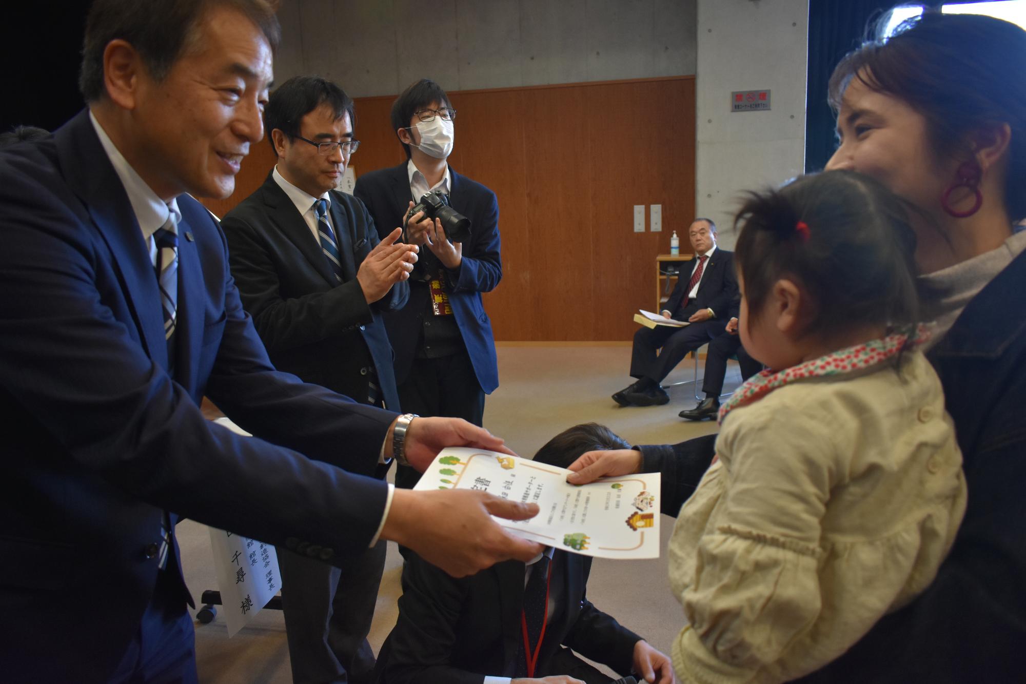「ウッドスタート」を宣言するためには、いくつかの事業を実施する必要がありますが、本市においては、木のおもちゃとの出会いの場を創出する「木育キャラバン」を昨年開催しました。この他、もう一つの必須事業として、生まれた赤ちゃんに地産地消の木製玩具を誕生祝品として贈呈する「誕生祝品事業」を実施するに至り、「ウッドスタート宣言調印式」と併せ、赤ちゃんに木製玩具を贈呈しました。また、「木育」推進に係る情報の発信に協力いただくべく、保護者の皆様に「木育推進員」を、赤ちゃんに「木育きっず隊 隊員」を任命しました。