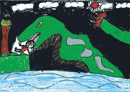 「暗やみに浮かび上がる大蛇がとても怖く描けていますね。